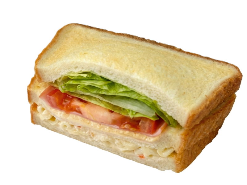 メインのハム野菜とマカロニ入りのポテトサラダを合わせた2層サンドです。温めることで食パンの香ばしさも加わり、更に美味しく食べられます。