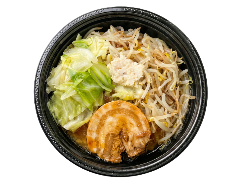 たっぷりの野菜・背油・にんにくをごはんに乗せて豚骨醤油スープで食べる、ボリュームのある丼ぶりです。※秋田・青森での販売はありません。