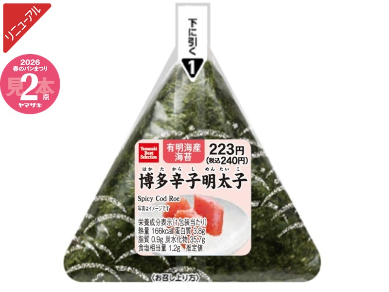 博多辛子明太子を使用しています。かつお出汁や昆布エキスの旨みと、後味にピリッと感じる辛みが特徴です。※「ヤマザキ春のパンまつり」対象商品です。