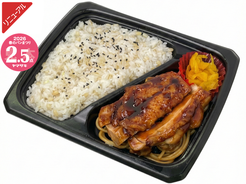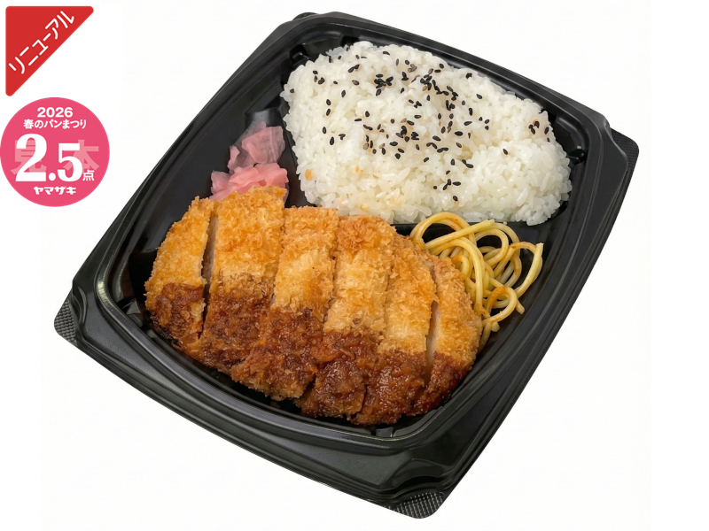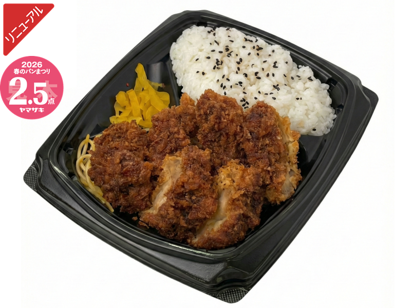 柔らかく仕上げたチキンカツを二枚のせて、たっぷりのソースをかけたボリュームのある弁当です。※「ヤマザキ春のパンまつり」対象商品です。