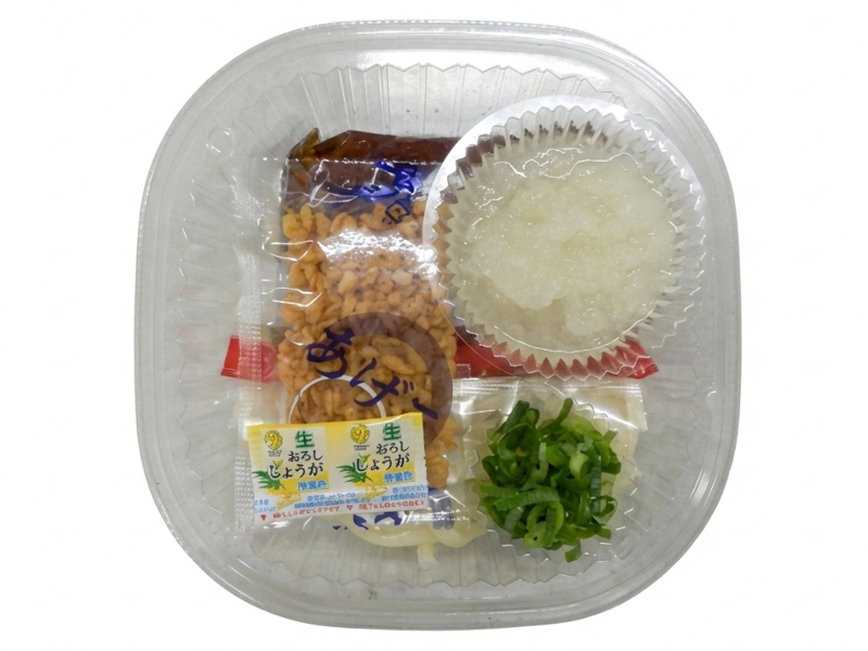 粗目の大根おろし器ですったザクザクした食感のある鬼おろしを入れました。揚げ玉の食感もアクセントになっています。※東北での販売はありません。