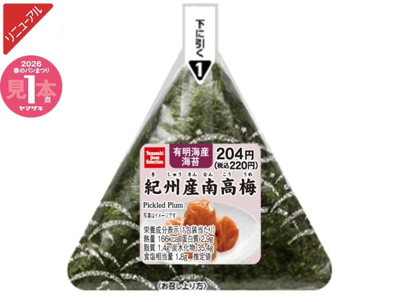 紀州産の南高梅を使用しています。しっかりと感じられる酸味と、たたき梅の具材感が特徴です。※「ヤマザキ春のパンまつり」対象商品です。