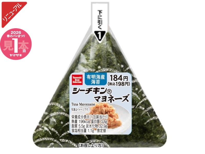 旨味の強いまぐろ100%のシーチキン®を使用。だし醤油・特製マヨネーズ・隠し味に砂糖でコクを出したシンプルな味付で、人気の商品です。※「ヤマザキ春のパンまつり」対象商品です。