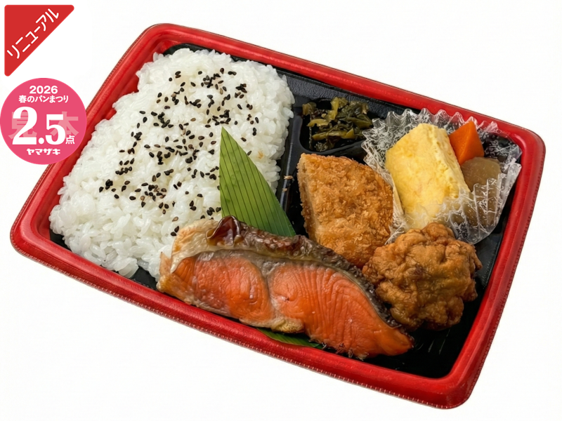 程よく脂がのった焼き紅鮭・煮物・玉子焼・唐揚・コロッケなどのおかずが味わえる和風幕の内弁当です。※「ヤマザキ春のパンまつり」対象商品です。