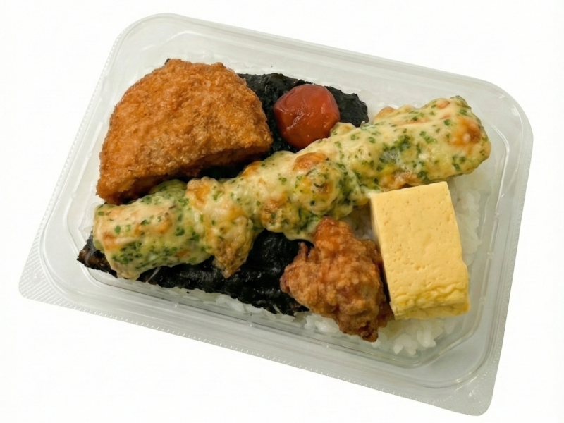 大きなちくわの磯辺揚げ・コロッケ・唐揚・玉子焼き・明太子を乗せました。