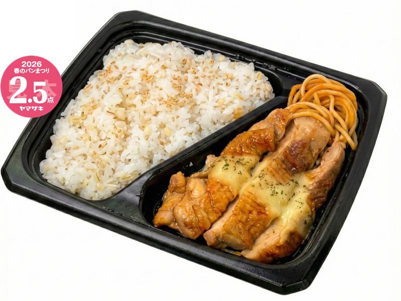 柔らかく仕上げた鶏ももの一枚肉にガーリックバター風味のソースをかけた、ボリュームのある弁当です。※「ヤマザキ春のパンまつり」対象商品です。