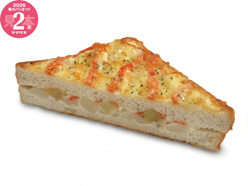 ポテトサラダと4種のチーズ(ゴーダチーズ、クリームチーズ、カマンベールチーズパウダー、ラクレットチーズ)を使用したチーズフィリング、明太子をサンドし、表面にオニオンマヨチーズをトッピングして焼き上げました。