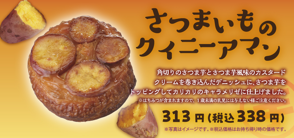 "角切りのさつま芋とさつま芋風味のカスタードクリームを巻き込んだデニッシュに、さつま芋をトッピングしてカリカリのキャラメリゼに仕上げました。 ※はちみつが含まれますので、1歳未満の乳児には与えない様ご注意ください。"
