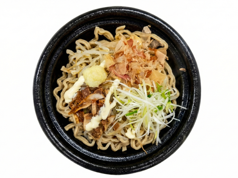 日本蕎麦を使用したまぜそばです。牛肉玉ねぎ煮・揚げ玉などを盛り付け、ラー油風味が味のアクセントの甘辛いタレで混ぜ合わせて食べます。※東北・九州での販売はありません。