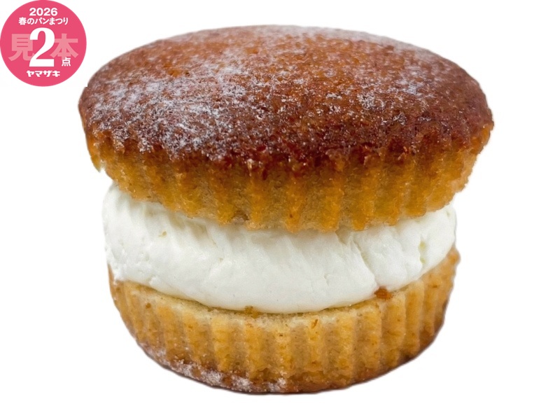アーモンドプードルとバターを配合したフィナンシェ生地を焼き上げ、ホイップとカスタードの2種類のクリームを絞りサンドしました。※「ヤマザキ春のパンまつり」対象商品です。