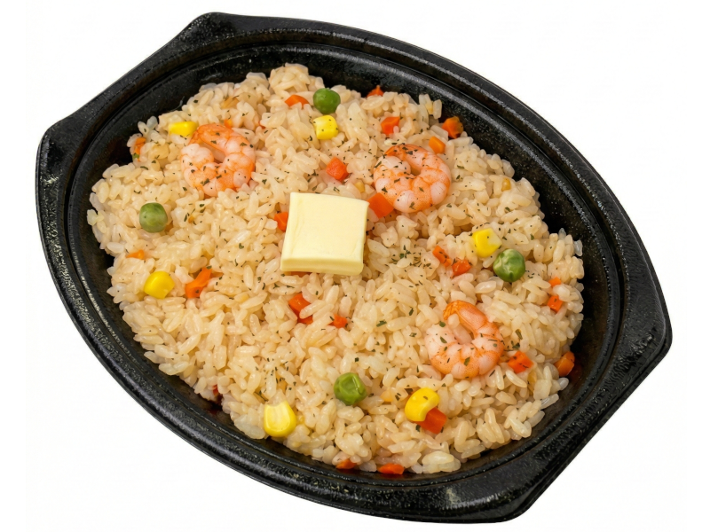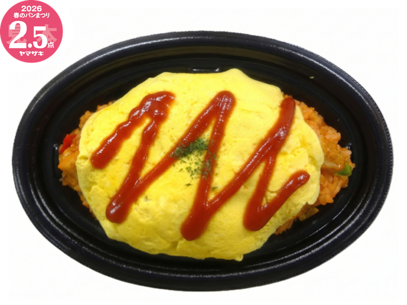 スチームチキンと3色ピーマンを合わせたケチャップライスの上に手作りの卵シートをのせ、トマトケチャップを波掛けしました。※スチームチキンの製造工場では、乳を使用した製品を生産しています。