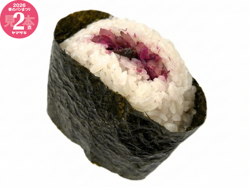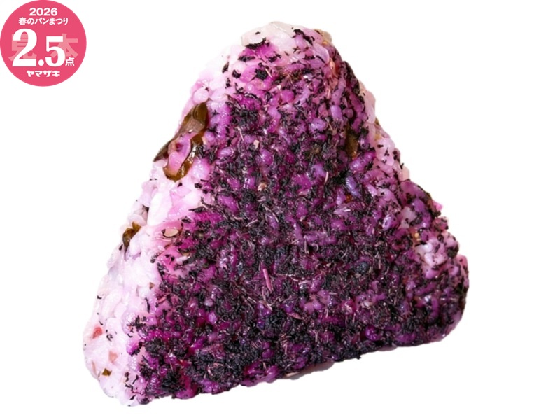混ぜ飯タイプの大きなおむすび。もち麦入りのご飯に、食感の良いしば漬けと彩りの良いゆかりを一緒に混ぜ込みました。※秋田・青森での販売はありません ※「ヤマザキ春のパンまつり」対象商品です。