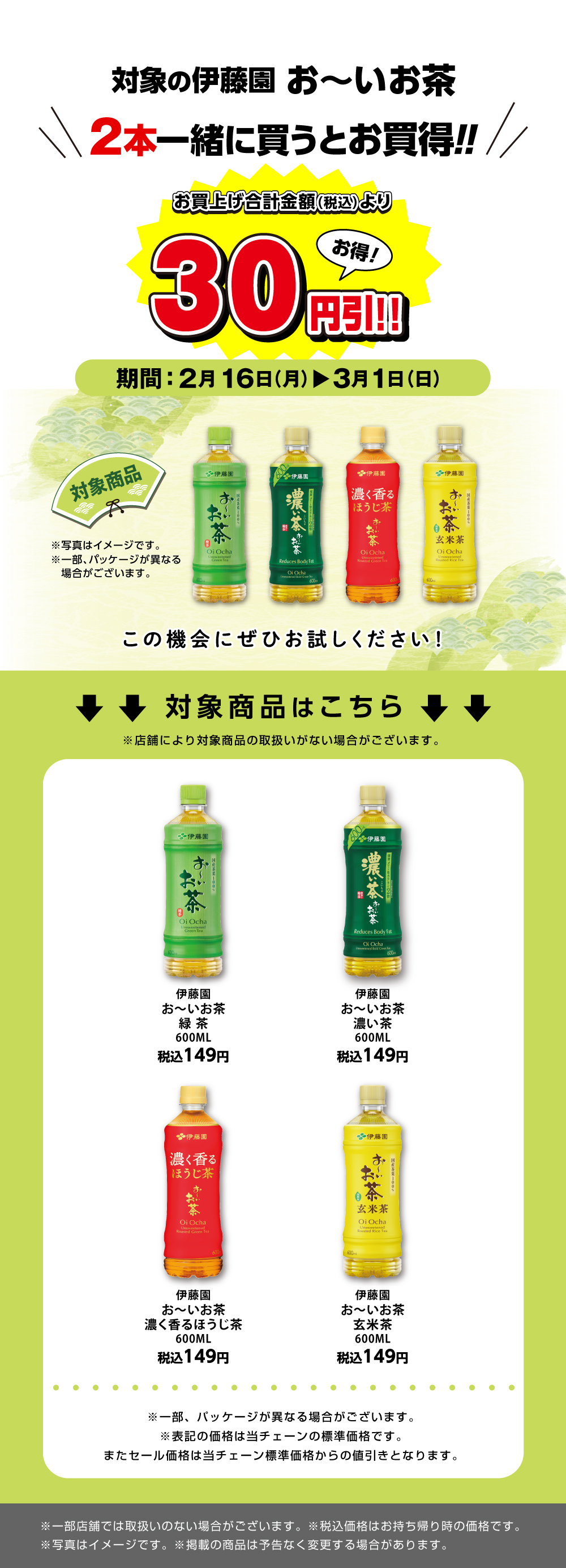 対象の『お~いお茶』を2本一緒に買うと30円引!