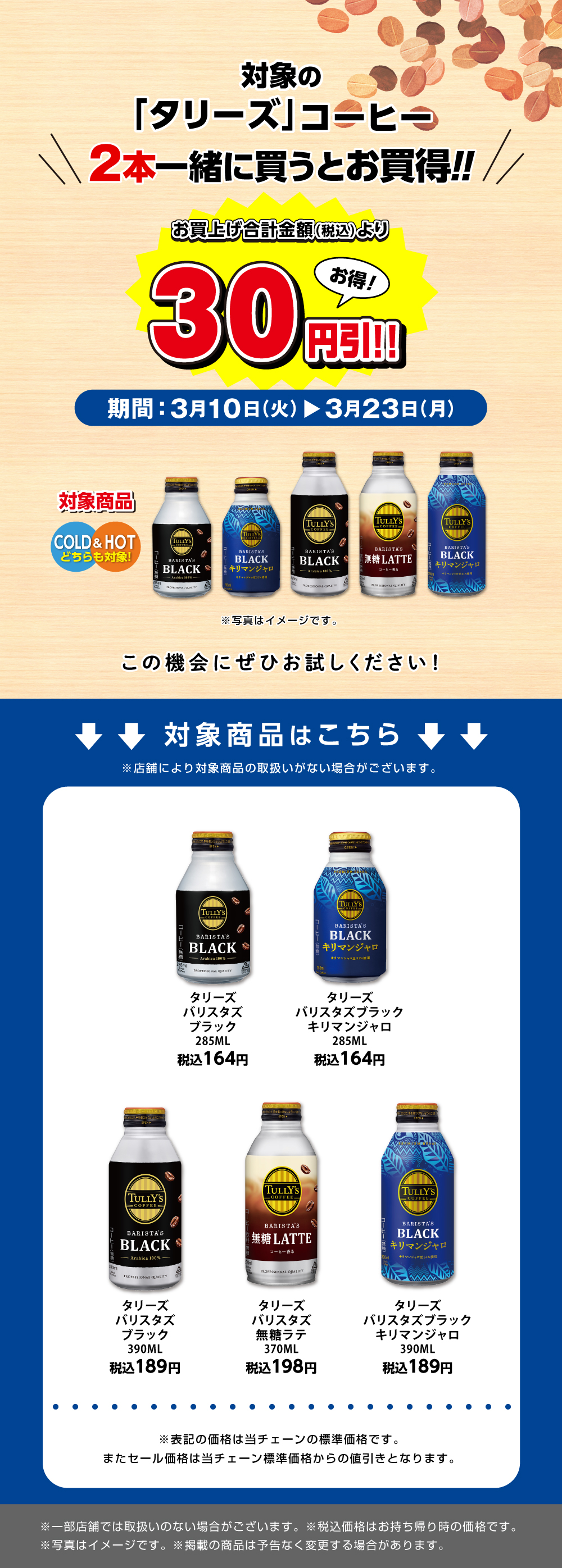 TOPおすすめ・キャンペーン情報対象の伊藤園『タリーズ』コーヒーを2本一緒に買うと30円引