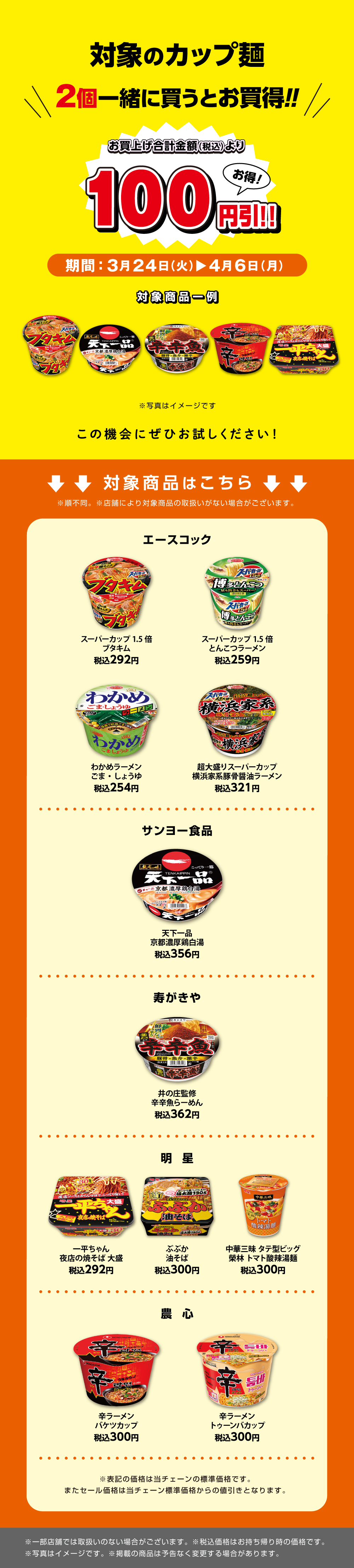対象のカップ麺を2個一緒に買うと100円引