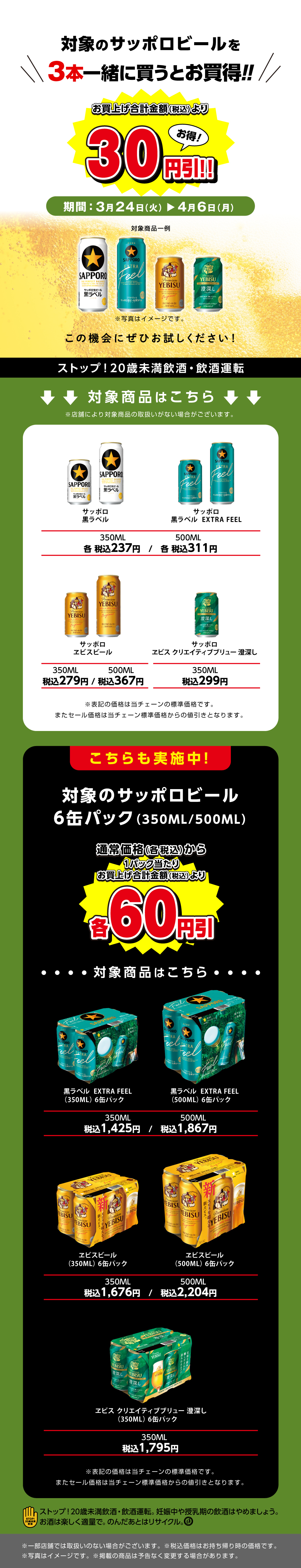 TOPおすすめ・キャンペーン情報対象のサッポロビールを3本一緒に買うと30円引