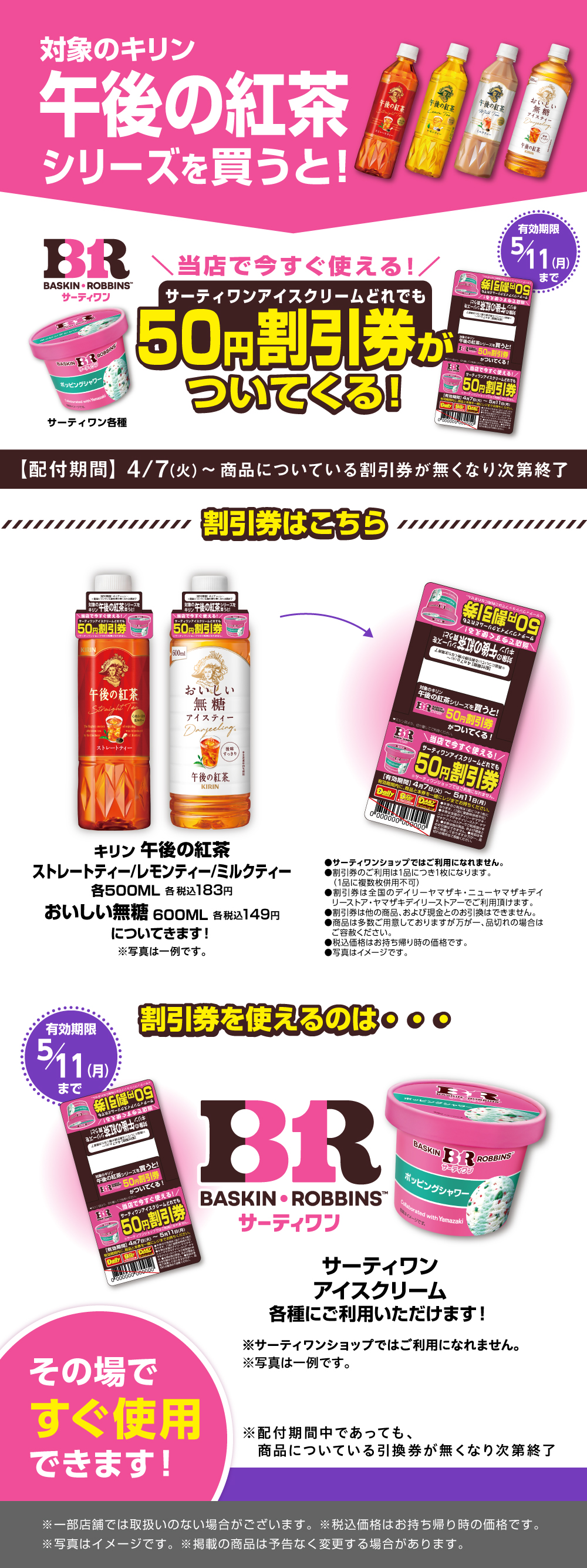 TOPおすすめ・キャンペーン情報対象の午後の紅茶シリーズを買うと、当店で使えるサーティワンアイスクリーム50円割引券がついてくる!