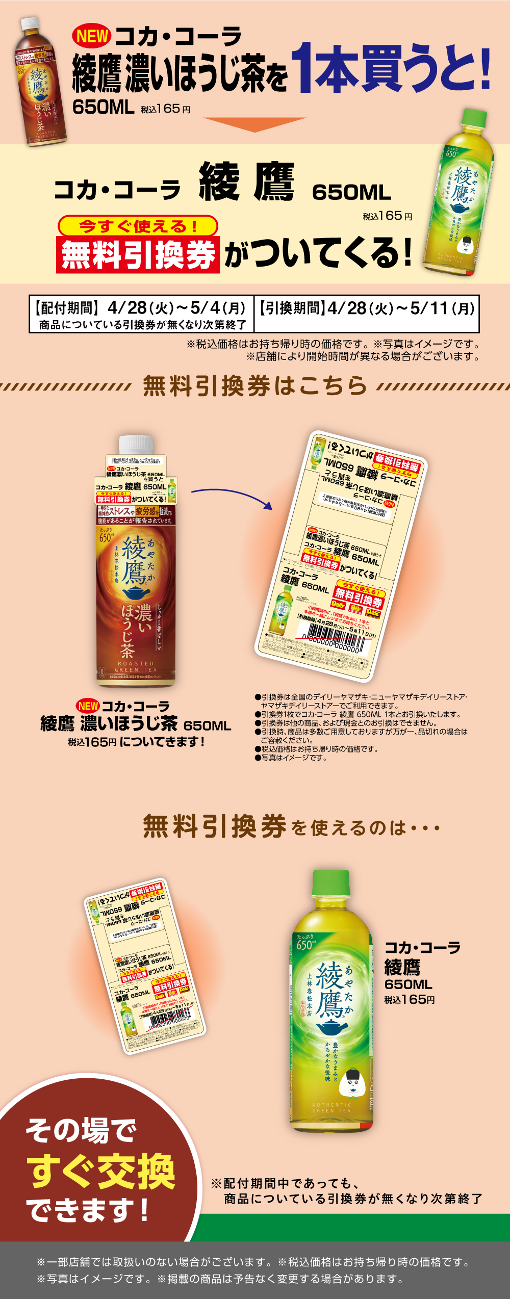対象の飲料を買うと『綾鷹 650ml』がもらえる!