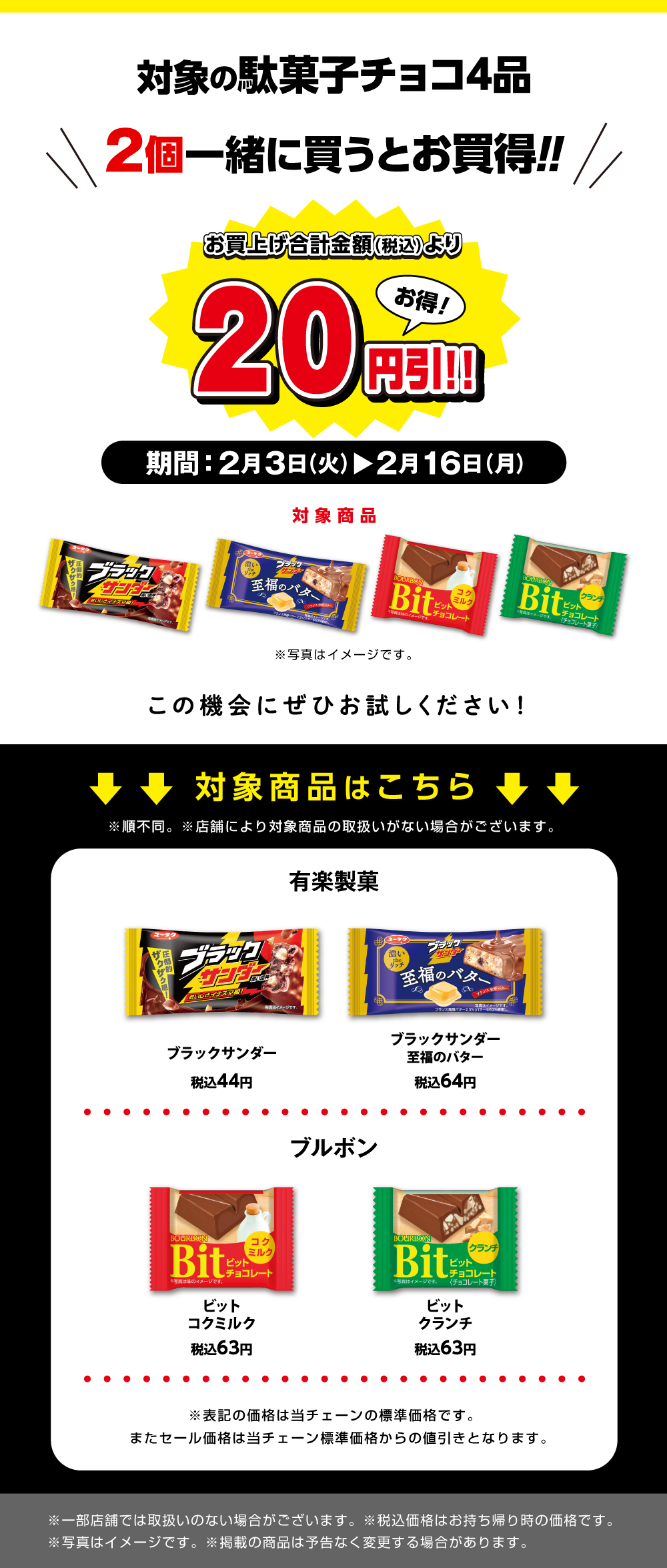 対象の駄菓子チョコを2個一緒に買うと20円引!