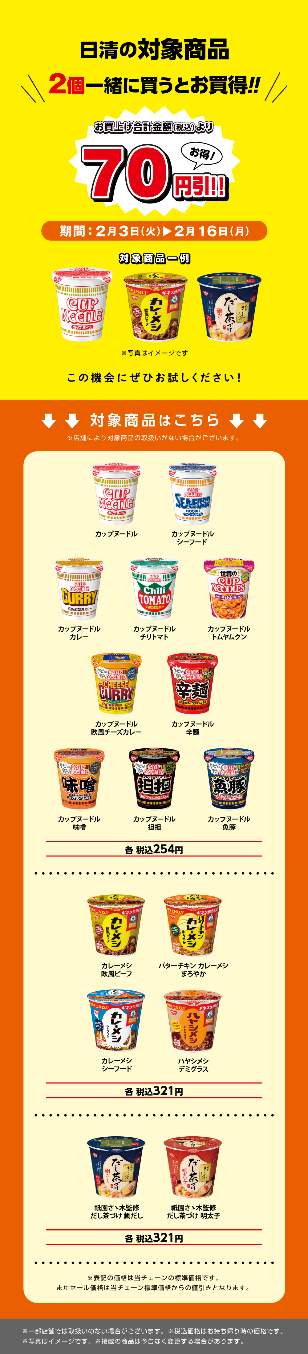 TOPおすすめ・キャンペーン情報対象の日清カップ麺・カップライスを2個一緒に買うと70円引