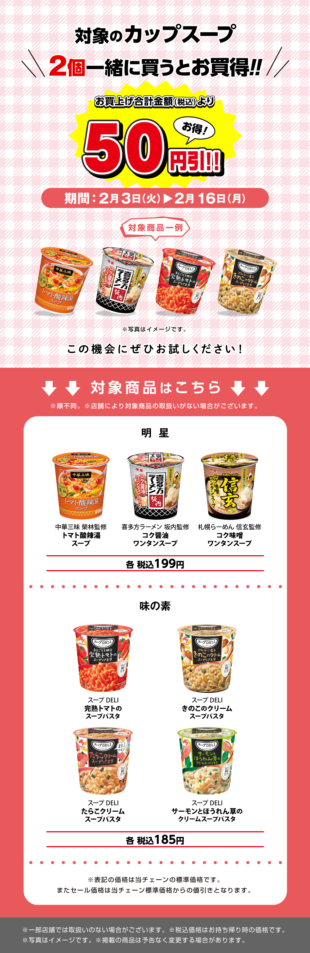 対象のカップスープを2個一緒に買うと50円引