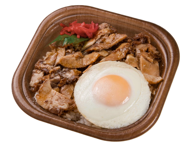 ご飯の上に甘い醤油タレで仕上げたチャーシューを敷いて、目玉焼をのせたボリュームたっぷりの弁当です。※秋田県・青森県の販売はありません。