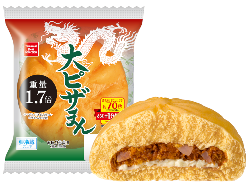 トマトの酸味のあるピザソースにとろ~りチーズを合わせました。ピザまん(※)の約1.7倍の重量があり、商品中の具材の割合をアップさせた、満足感たっぷりの商品です。(※)「ヤマザキベストセレクション ピザまん」との比較