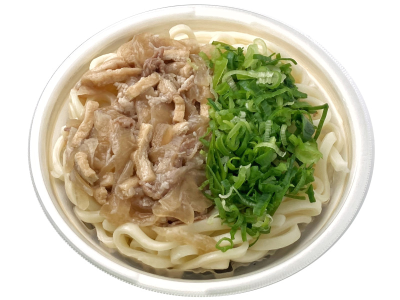 だしに酒、醤油、みりんなどで甘辛く炊いた牛肉煮、玉ねぎ・油揚げ煮を盛り付けたうどんです。※九州地方の販売はありません。