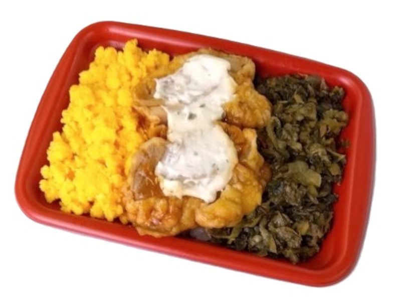 お肉を柔らかく仕上げた鶏唐揚に甘酢たれ・タルタルソースをかけ、高菜と玉子そぼろを合わせたお買い求めやすい弁当です。