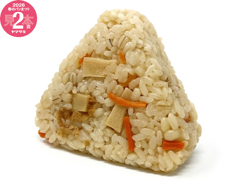 食べ応えのある大きなおむすび。もち麦入りのご飯に、春が旬のたけのこ・玉ねぎ・人参・きざみ揚げを混ぜ込みました。 ※秋田・青森での販売はありません。 ※「ヤマザキ春のパンまつり」対象商品です。