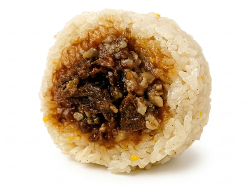 ご飯の上に具材を乗せた、食べ応えのあるおにぎり。玉ねぎ・玉子を炒めてシンプルに仕上げた玉子炒飯の上に、炭火で香ばしく焼いた牛カルビを乗せました。