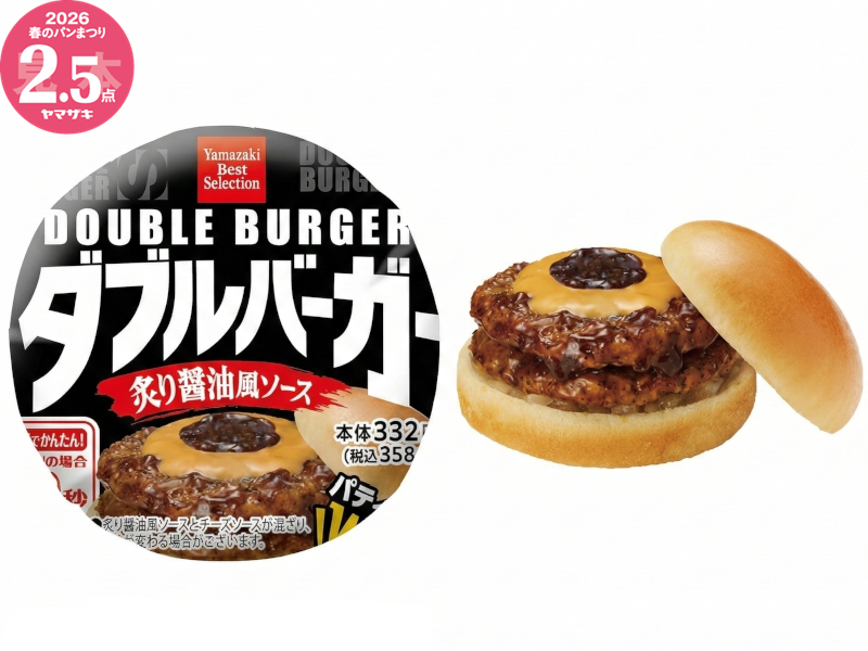 炙り醤油風ソースにつけたパティを2枚、カットオニオンの上に乗せて、さらにチェダーチーズ入りチーズソースと炙り醤油風ソースをトッピングしました。 ※「ヤマザキ春のパンまつり」対象商品です。