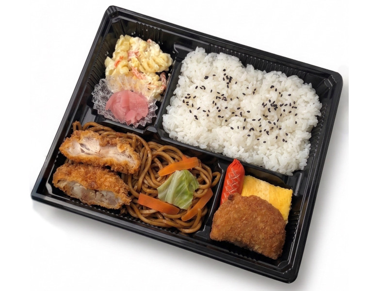 チキンカツをメインに、焼きそばやコロッケ、マカロニサラダなど食べ応えのある副菜と合わせた弁当です。